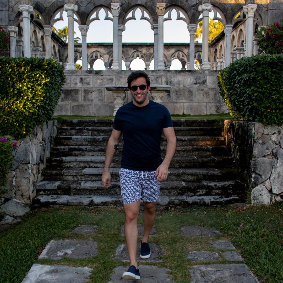 Dunkelblaue Badeshorts mit Muster Frontansicht Andrew&Cole